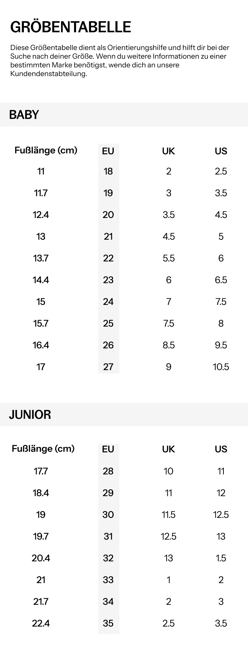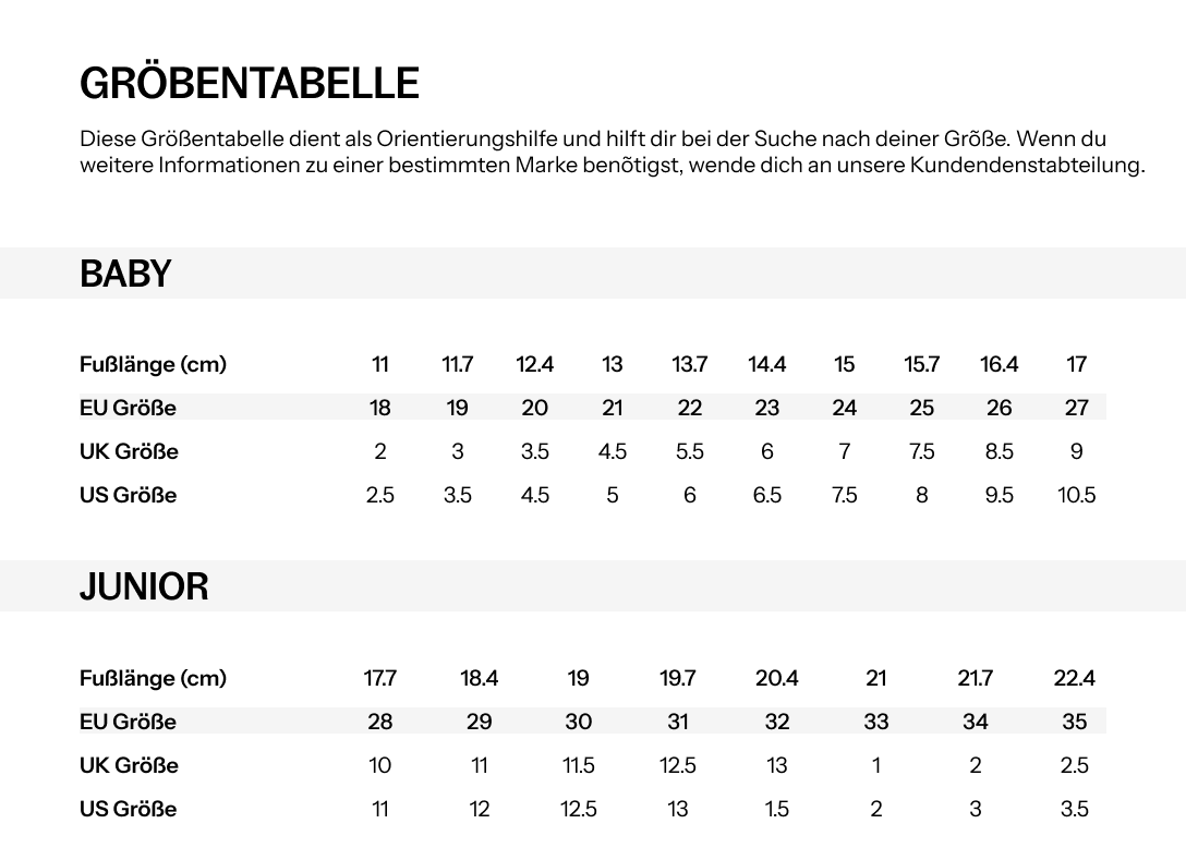 Keine Sorge, unser Kundendienst hilft Ihnen gerne bei allen Fragen und empfiehlt die Schuhe, die am besten zu den Bedürfnissen Ihrer Kleinen passen.