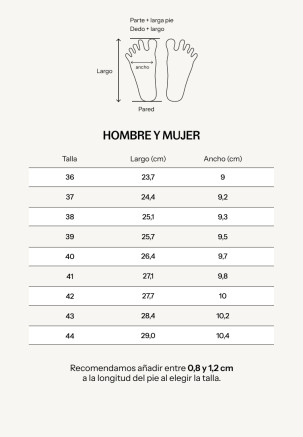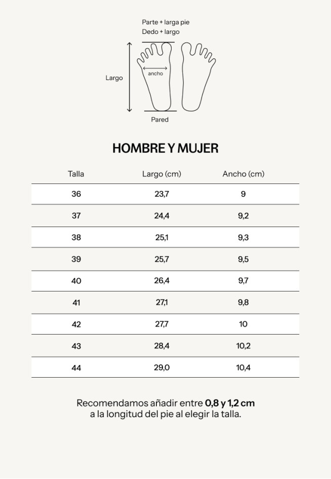 Mide tu pie y añade entre 0,8 y 1,2 cm de holgura. En mocasines, mejor quedarse en 0,8 cm.