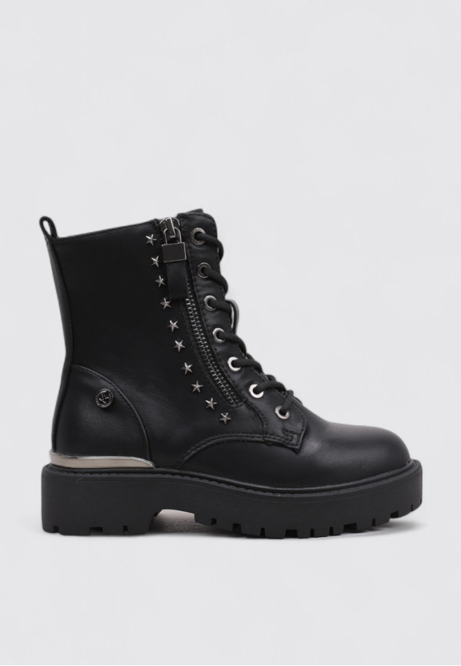 Las BOTAS PLANAS de estilo MILITAR de la marca X.T.I KIDS en color Negro están diseñadas para ofrecer un equilibrio entre funcionalidad y diseño. El modelo 151345 incorpora características propias de este tipo de calzado, aportando un acabado que resalta su identidad. Confeccionadas en otros materiales y pensadas para Niña, proporcionan sujeción y resistencia, adaptándose a diferentes combinaciones y ocasiones.